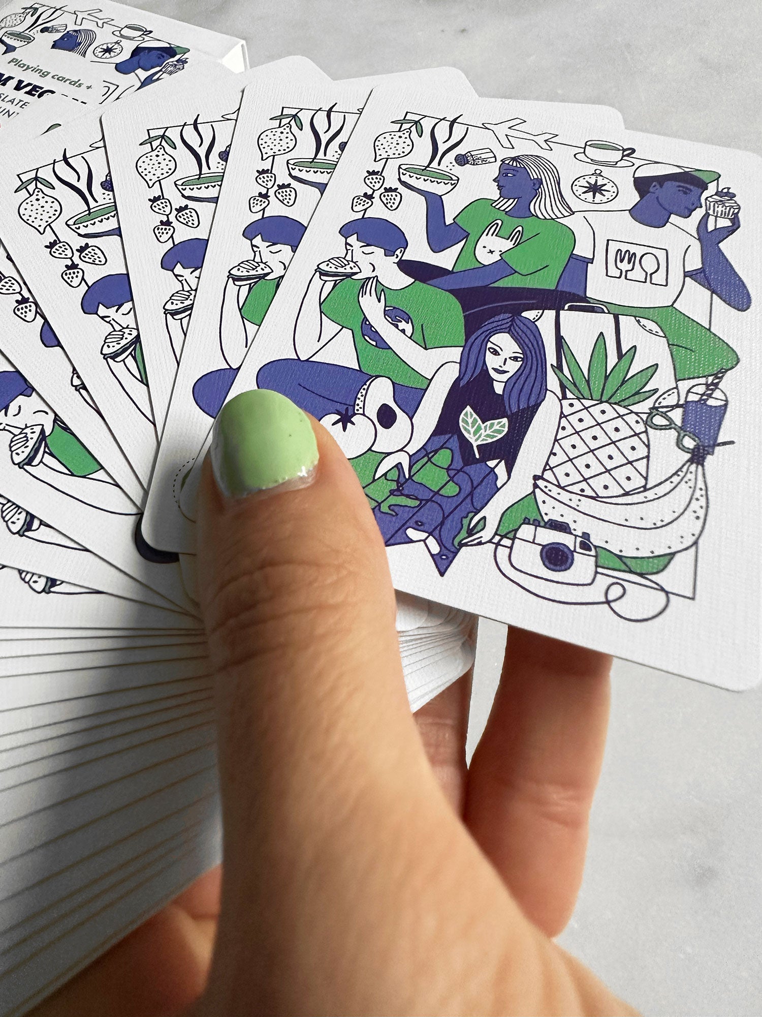 The vibrant and expressive designs for the back of the playing cards, as well as the packaging, are the result of Kate’s creative talent. The brief given to her was: to encapsulate the essence of vegan travellers enjoying international cuisines while enjoying their dietary choices. Kate not only met this challenge but exceeded all expectations, infusing each illustration with life and character.